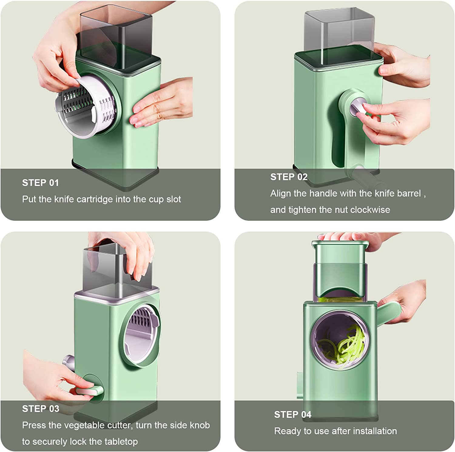 High-Quality Materials - the three slicer blades are made of high-quality stainless steel and other parts are made of food-grade plastic that is strong and durable. the cheese grater is removable and does not break easily, make sure it can be used last a long time.